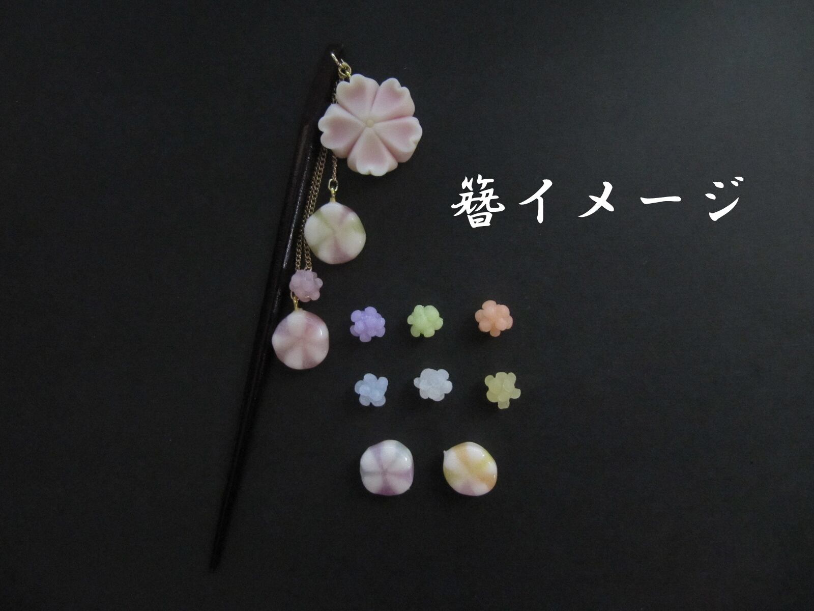 練り切り部分は樹脂粘土、飴部分はすけるくんとUVレジン、金平糖はすけるくんです。